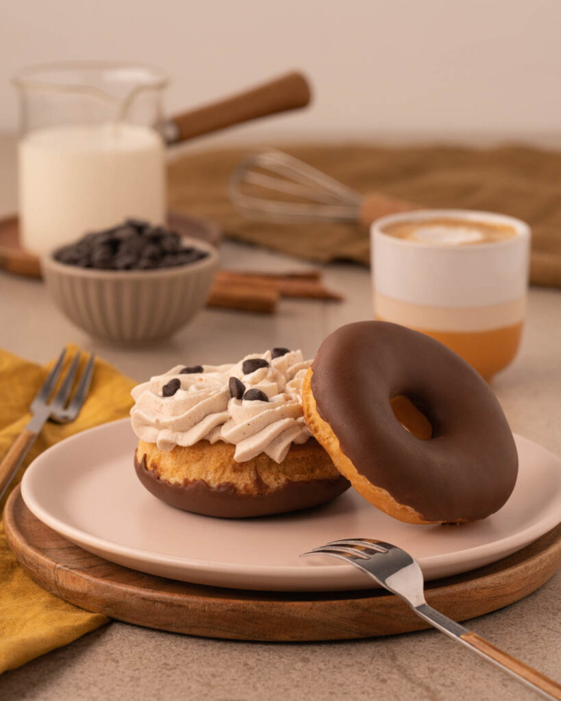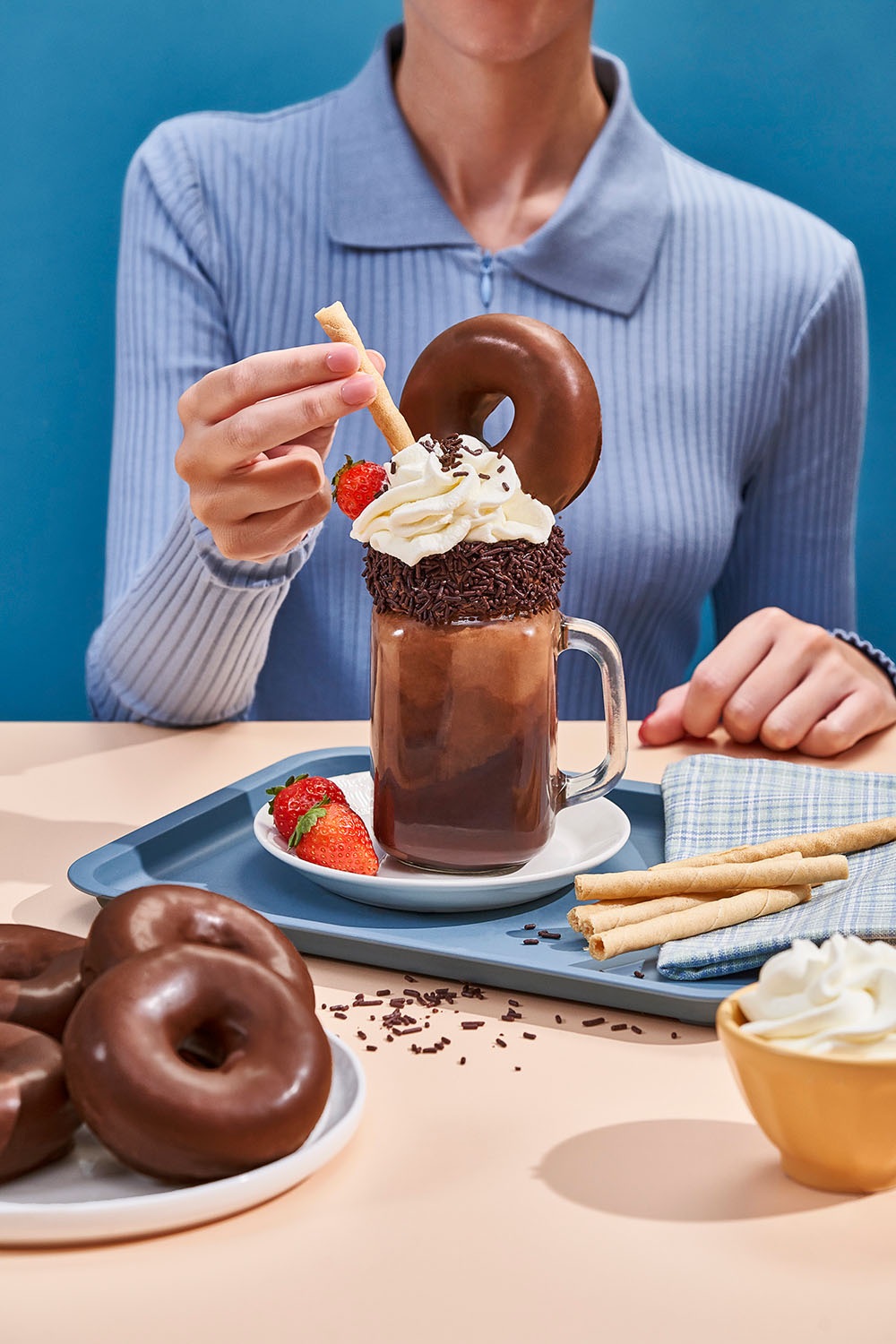 Esta receta convierte tu Donuts® en una experiencia extra golosa: servido sobre un batido de chocolate, coronado con nata montada, virutas crujientes y un toque final irresistible. Ideal para disfrutar sin prisas.