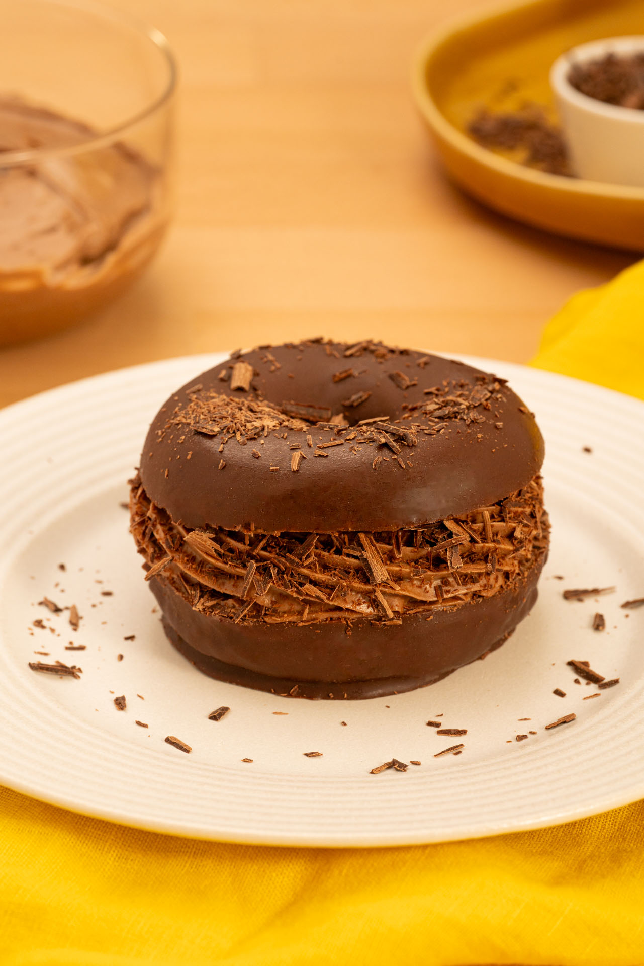 Un Donuts® de chocolate relleno con una mousse cremosa y cubierto con virutas intensas de cacao. Perfecto para darte un capricho… o compartir (¡si puedes!).