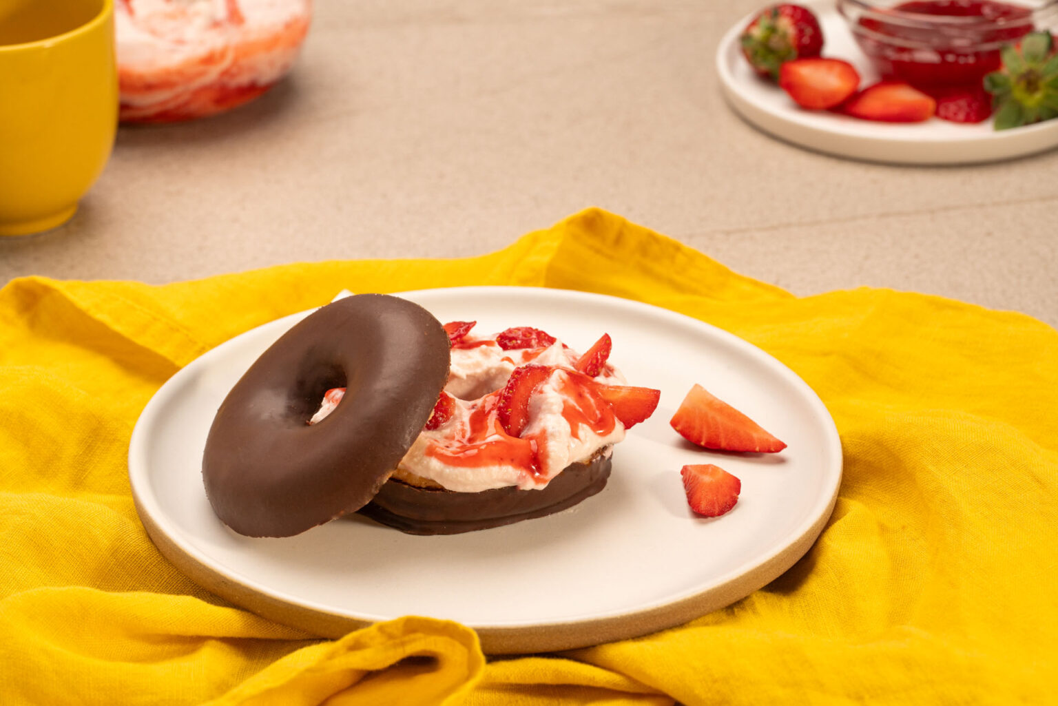 Coloca la parte superior del Donuts® encima y decora con más fresas y un chorrito de sirope si deseas darle un toque extra. - Sirve y disfruta