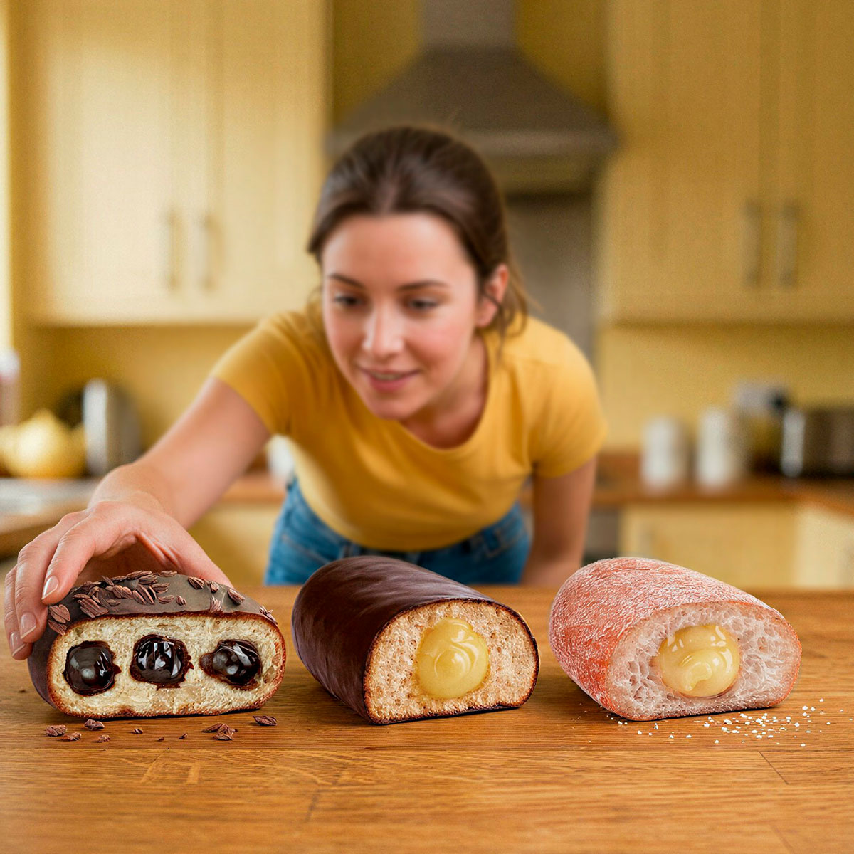 Esponjosa y deliciosa, con cobertura de cacao, virutas de chocolate y un relleno cremoso que se disfruta en cada bocado.